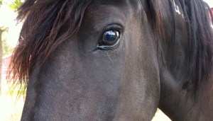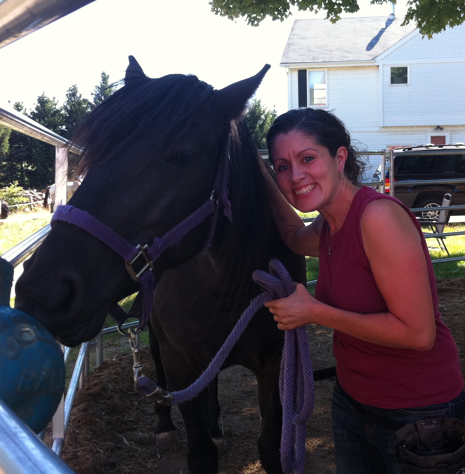The video shows our fourth session working together in the pen. We are nearly at 60 days of work and our list of skills is: will self-halter, can stand quietly for fly-spray over entire body, can stand quietly at target for curry comb, hard brush and all over body handling, will stand while I enter pen, allows rope to be clipped on halter willingly, can back up off of light lead rope pressure, can move forward off of light lead rope pressure, can stand quietly at target while being touched all over body, can back off of a chest touch or nose touch, can target an open hand or physical target. All of these things were taught through the panels – it’s just this week that I will be making bigger loops for back up (asking for more steps) and refining her leading so she can start to go out and play in the pasture with our other mares. To me, the most beautiful part of all of these skills is that Djinn is a willing participant. Instead of learning how to let things be done to her, she has learned how to place her head into her halter, to touch her target with her nose while being groomed, to back up off of a light suggestion. She collaborates with me in the process and demonstrates her understanding with measurable behaviors.