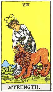 The eighth card in the Tarot deck is Strength. It’s a picture of a woman with a lion, closing his mouth with her bare hands. The card represents complete mindfulness. Being so aware, non-reactive and intentional that even a lion would do your bidding because of your clean, clear energy. Every action is thoughtful and peaceful with this card. It is one of the cards tacked above Tarot’s stall  as a directive, a reminder. Patience, gentleness, self-awareness.
